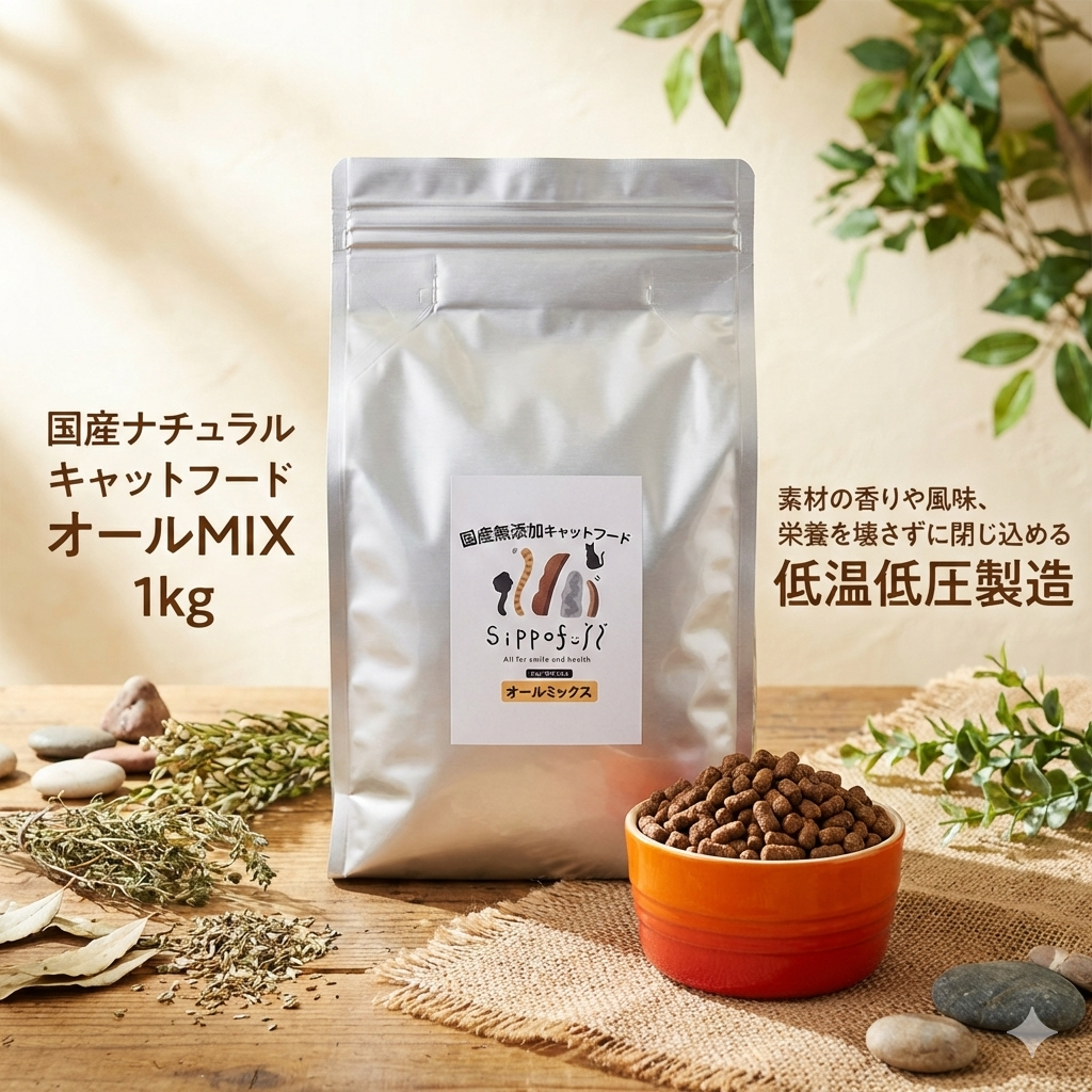 粗タンパク質39%以上、粗脂肪16%以上、粗繊維3.5%以下、粗灰分7.5%以下 水分10%以下、ナトリウム0.4%~0.45%、リン1.1%~1.2%、マグネシウム0.19%~0.2%、370kcal/100g